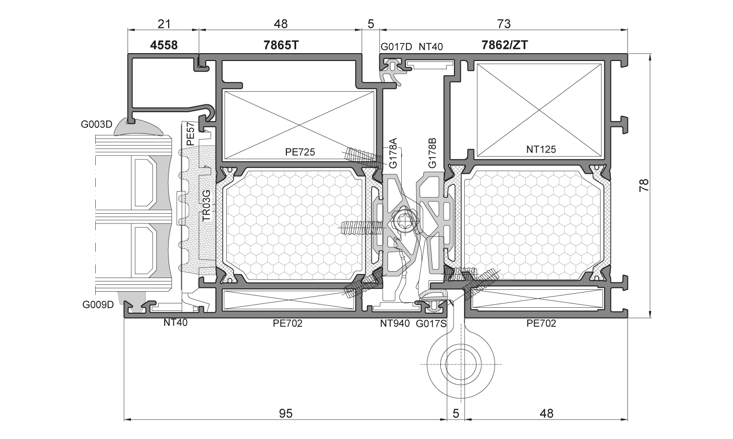 - verschillende varianten thermische isolatie, afhankelijk van de gebruikte isolatie-elementen: PE78N+, PE78NHI, PE78NHI+