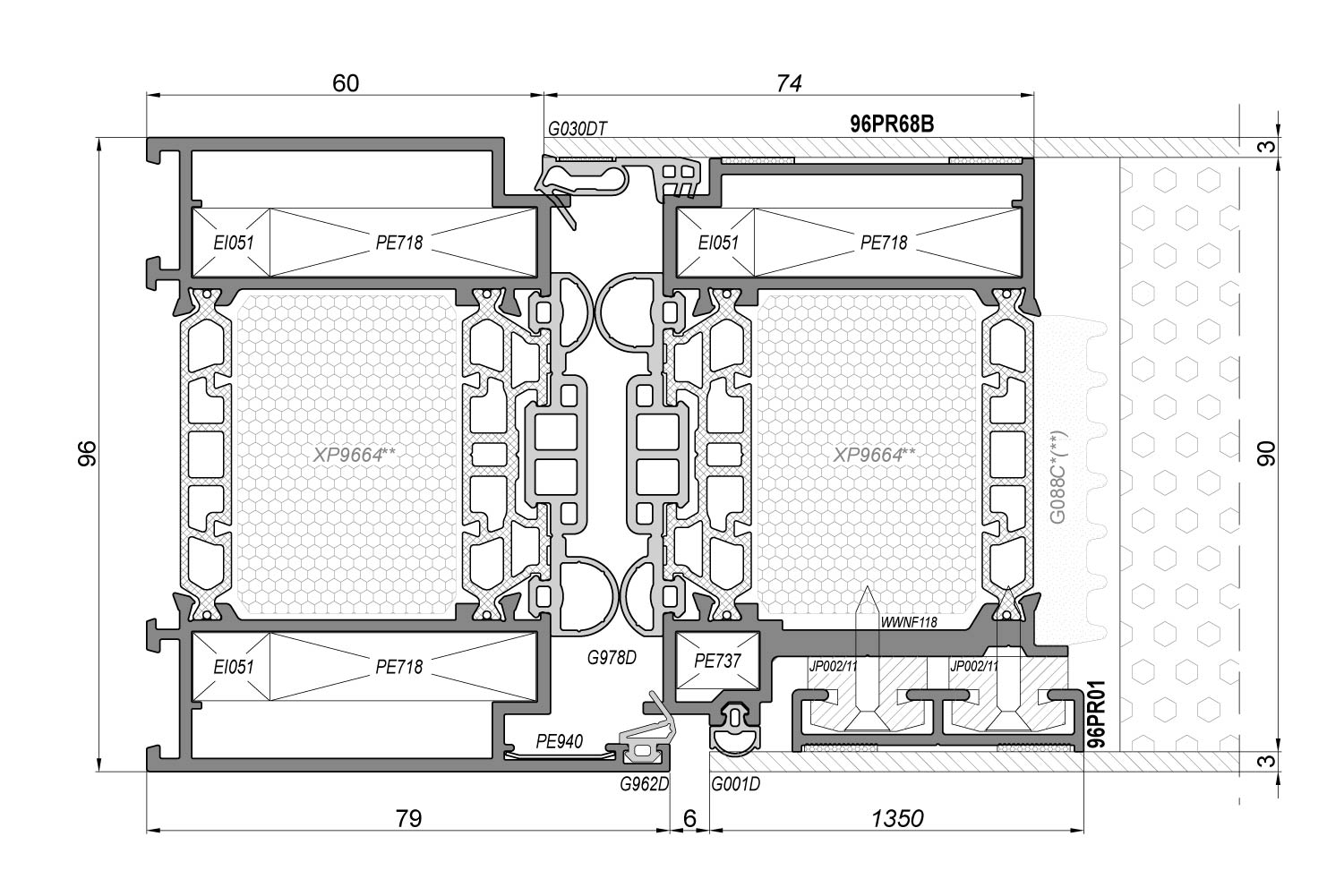 - constructie van coplanaire profielen (sponningafstand – 18 mm)