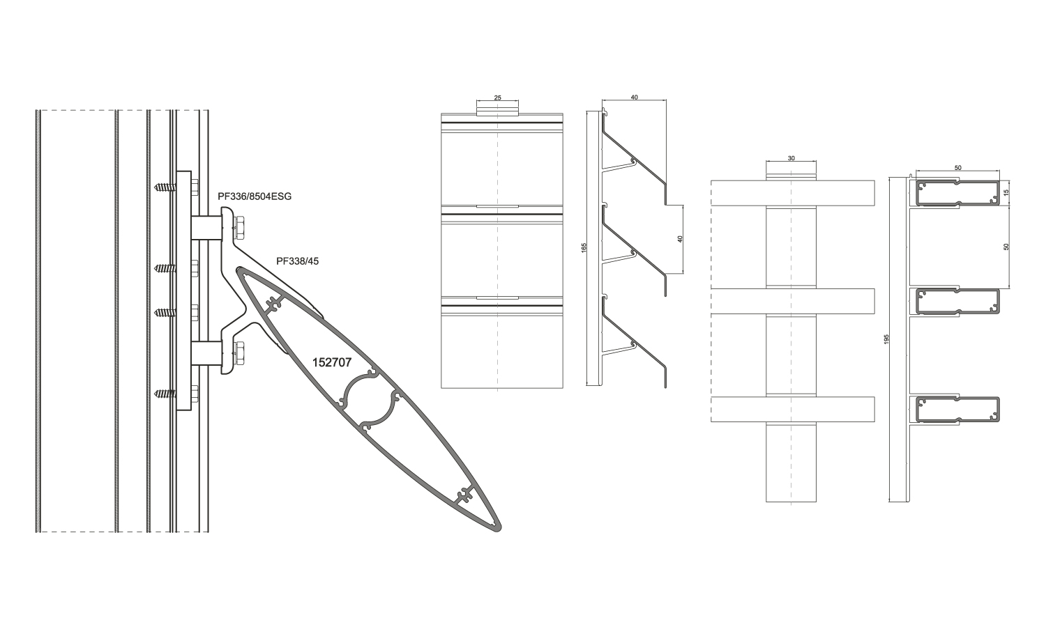 • Dankzij het systeem van bevestigingsmiddelen en montagebeugels kunnen de profielen loodrecht op de muur van het gebouw worden bevestigd en in een hoek van 15°, 30° en 45° ten opzichte van de horizontaal